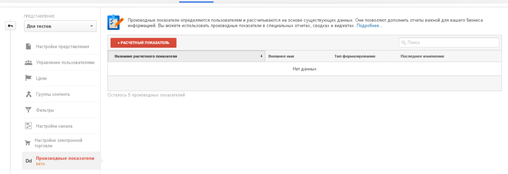 После этого перейдите по пункту меню Производные показатели, у вас отобразится список имеющихся показателей, если они были созданы, или пустая таблица, если ранее в представлении такие действия не выполнялись: