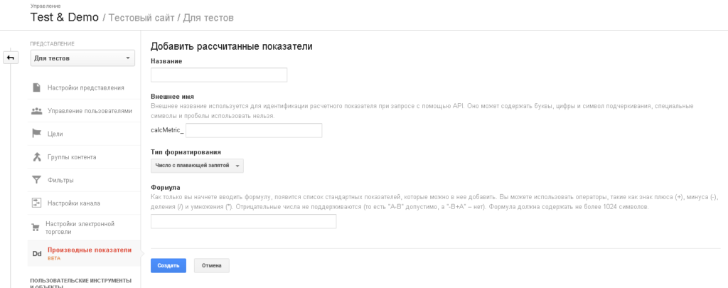 Для создания нового производного (вычисляемого) показателя Google Analytics нажмите кнопку + Расчетный показатель и заполните предлагаемую форму:
