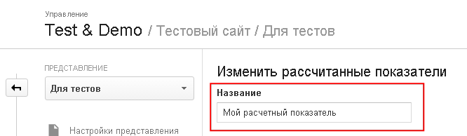 Первое поле название. Здесь укажите такое имя, которое затем будет использоваться в отчетах. Например, создали расчетный показатель Google Analytics: