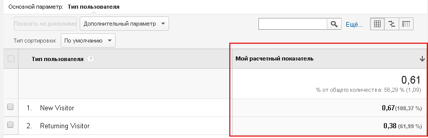 Теперь все можно сделать непосредственно в Google Analytics. Создать свой производный (вычисляемый) показатель, выполнить его настройку, после чего работать с ним в отчетах Google Analytics в привычном интерфейсе.