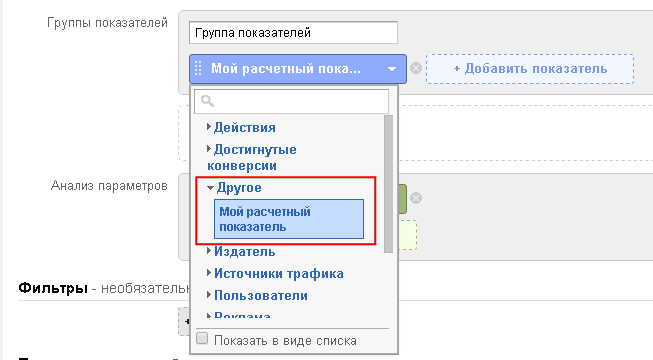 Обратите внимание, что созданные вами показатели находятся в группе Другое, при выборе показателей из выпадающих списков: