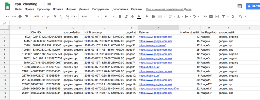 В каждой строчке кода находятся комментарии, потому можно разобраться в моей логике обработки данных и по необходимости усовершенствовать скрипт. Напомню, скрипт позволяет получить таблицу в Google Sheets, которая показывает список всех пользователей (ClientID), для которых на одной и той же странице в пределах 60 секунд была зафиксирована смена источника трафика.