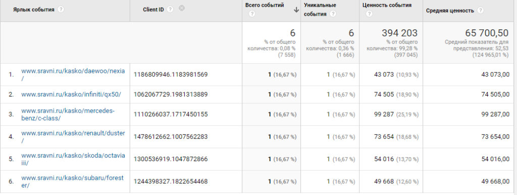 В итоге в отчете по событиям Google Analytics мы увидим примерно такую картину:
