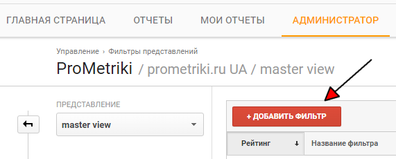 Для решения задачи необходимо создать пользовательский фильтр Google Analytics. Перейдите к настройкам представления Google Analytics в котором необходимо добавить фильтр, затем выберите пункт Фильтры и нажмите добавить: