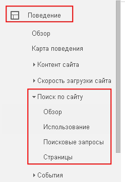 После выполнения описанных выше операций, спустя некоторое время в отчетах появится соответствующая информация. Группа отчетов Поиск по сайту располагается в разделе Поведение: