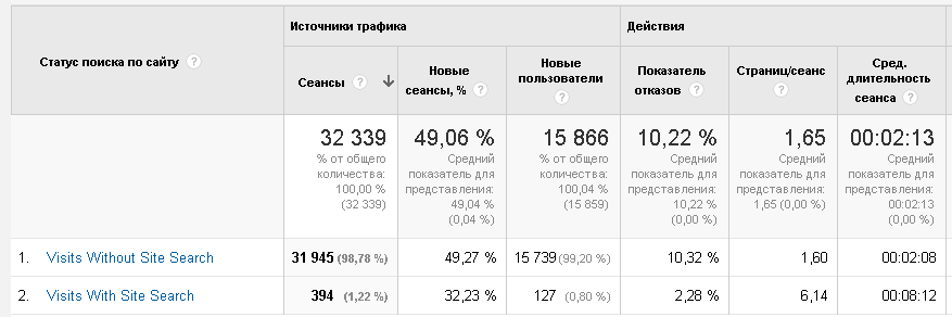 В первом отчете вы можете ознакомится с общей информацией о поиске на сайте, во втором можно сравнить использование сайта между группами посетителей, которые использовали поисковый механизм и теми, кто этой возможностью не пользовался: