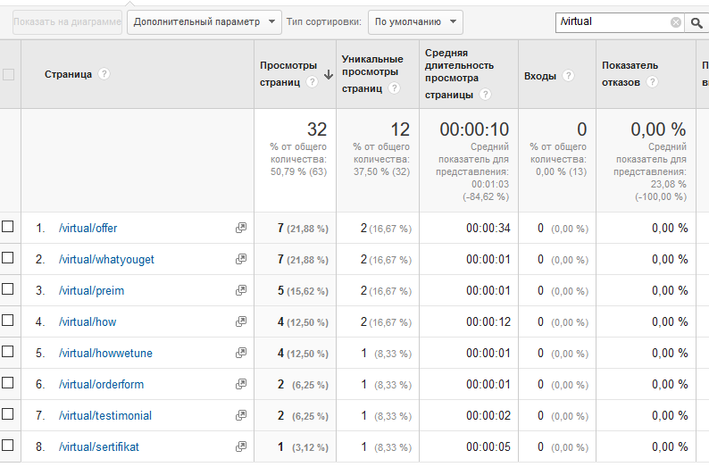 Для систем веб анализа наш одностраничный сайт превращается в «многостраничный», а раз так, то появляется «просмотры» и время посещения «виртуальной» страницы, в нашем случае — раздела сайта. А эти данные уже можно легко можно обработать стандартными методами и построить нужные отчеты.