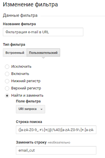 - Для фильтрации e-mail в URL будем использовать пользовательский фильтр «Найти и заменить».