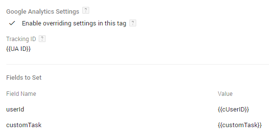 Теперь нужно к вашему тегу Universal Analytics добавить поле customTask со значением {{ customTask }}: