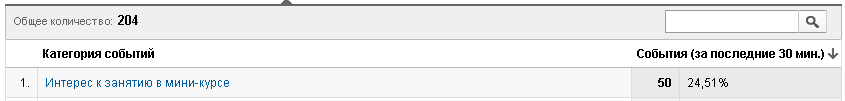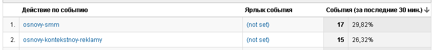 По умолчанию отображаются события сгруппированные по Категории. Напомню, что при фиксации события в Google Analytics необходимо обязательно указать категорию и действие, дополнительно может быть использован ярлык события.