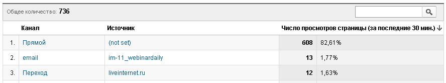 В которой первый столбец отображает канал трафика, второй источник трафика, третий и четвертый – количество просмотров страниц и процентное соотношение к общему количеству просмотров страниц за последние 30 минут для пары канал/источник.