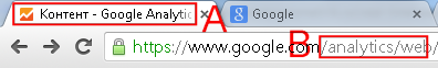 Столбец Активная страница содержит URL страницы относительно доменного имени сайта (B), а Название страницы отображает содержимое тега TITLE страницы (A).