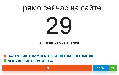 Просматривая отчет Обзор под общим количеством посетителей на сайте в текущий момент выводится информация по устройствам используемым для просмотра страниц вашего сайта: