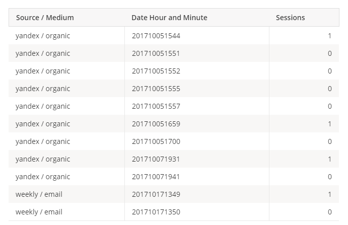 • sort: ga:dateHourMinute — чтобы самая первая сессия отображалась в первой строке.