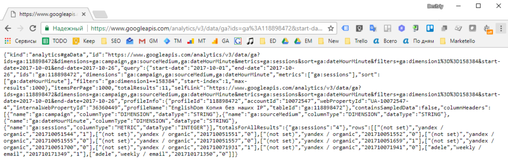 https://www.googleapis.com/analytics/v3/data/ga?ids=ga%3A118898472&start-date=2017-10-01&end-date=2017-10-26&metrics=ga%3Asessions&dimensions=ga%3AsourceMedium%2Cga%3AdateHourMinute&sort=ga%3AdateHourMinute&filters=ga%3Adimension1%3D%3D158384&access_token=ya29.Gl30BMgGpR89kexsBJS8VMIWimIEghKVHubx9iQH7RljCyQNLjX2LLBQ9AyCCRW9K0TjfJEvwe6qY3SIRKbkm8idMZjdygbN647O7JUgXqcGyDt5b63Y2FjDbeQabfA