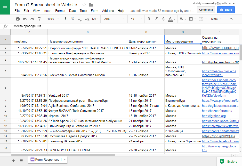 Для примера, я возьму таблицу, в которую падают результаты из Google Формы.