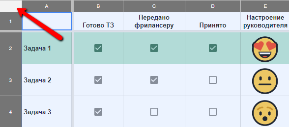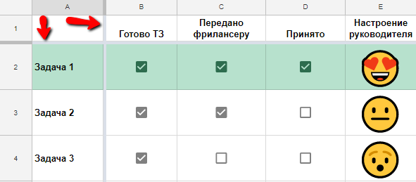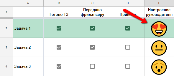 В нашем примере, если все 3 галочки проставлены — то строка заливается зеленым фоном.
