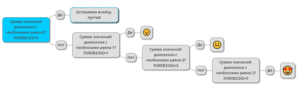 =IF(SUM(B2:D2)=0,"",IF(SUM(B2:D2)=1,"😯",IF(SUM(B2:D2)=2,"😐",IF(SUM(B2:D2)=3,"😍"))))