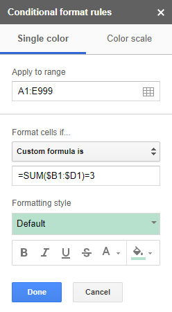 То есть, выбран пункт Форматировать ячейку, если Пользовательская формула =SUM($B1:$D1)=3.