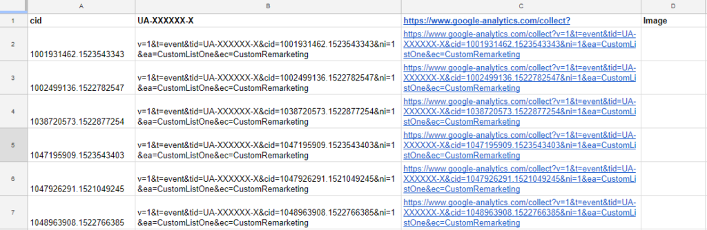 https://www.google-analytics.com/collect?v=1&t=event&tid=UA-XXXXXXX-X&cid=1001931462.1523543343&ni=1&ea=CustomListOne&ec=CustomRemarketing